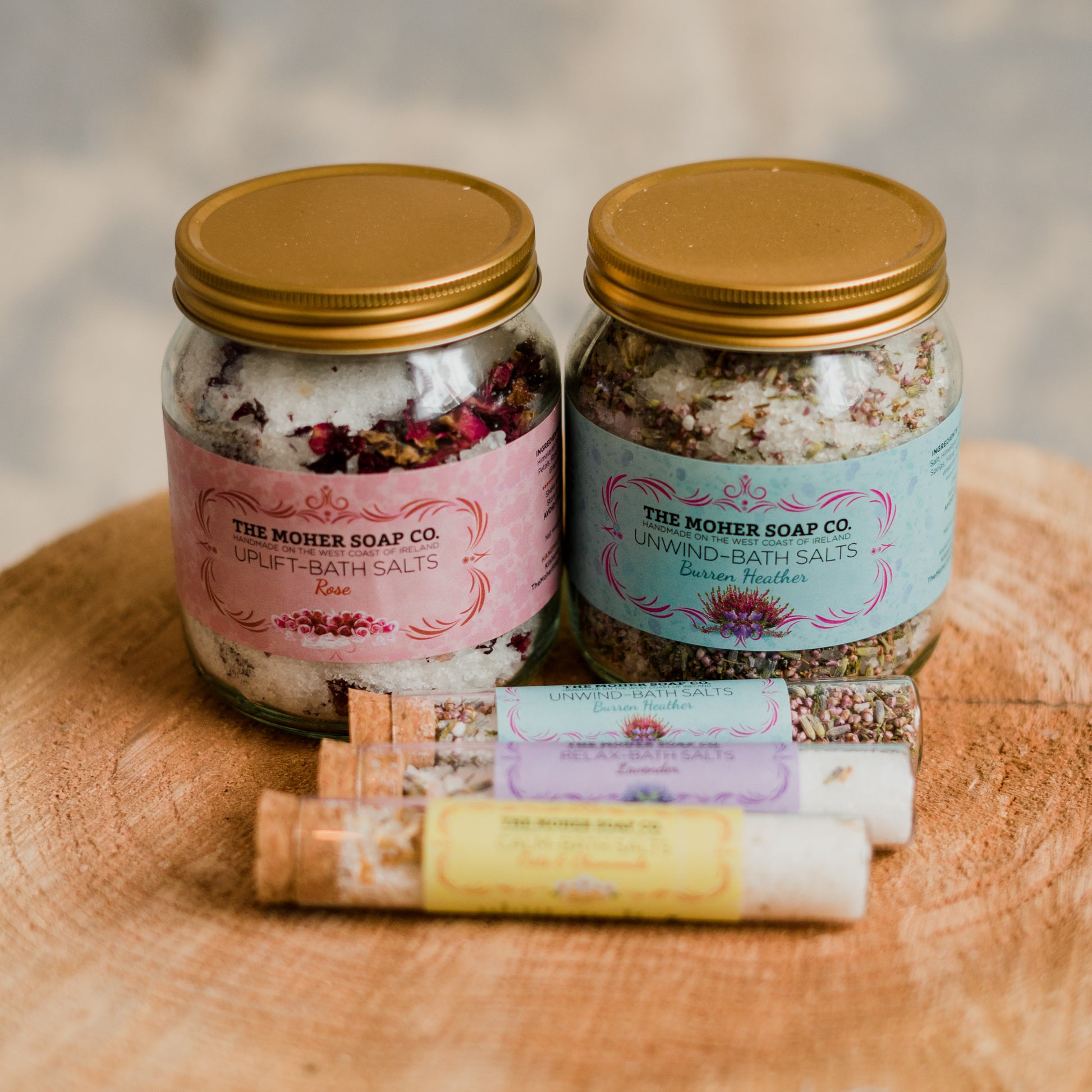 A natural blend of Salts, Essential oils and Botanicals from the Moher Soap Company. These are available in a 320g jar or a 20g glass vial (perfect amount of salts for a single bath, ideal for gifts, travel or to sample one of our varieties).