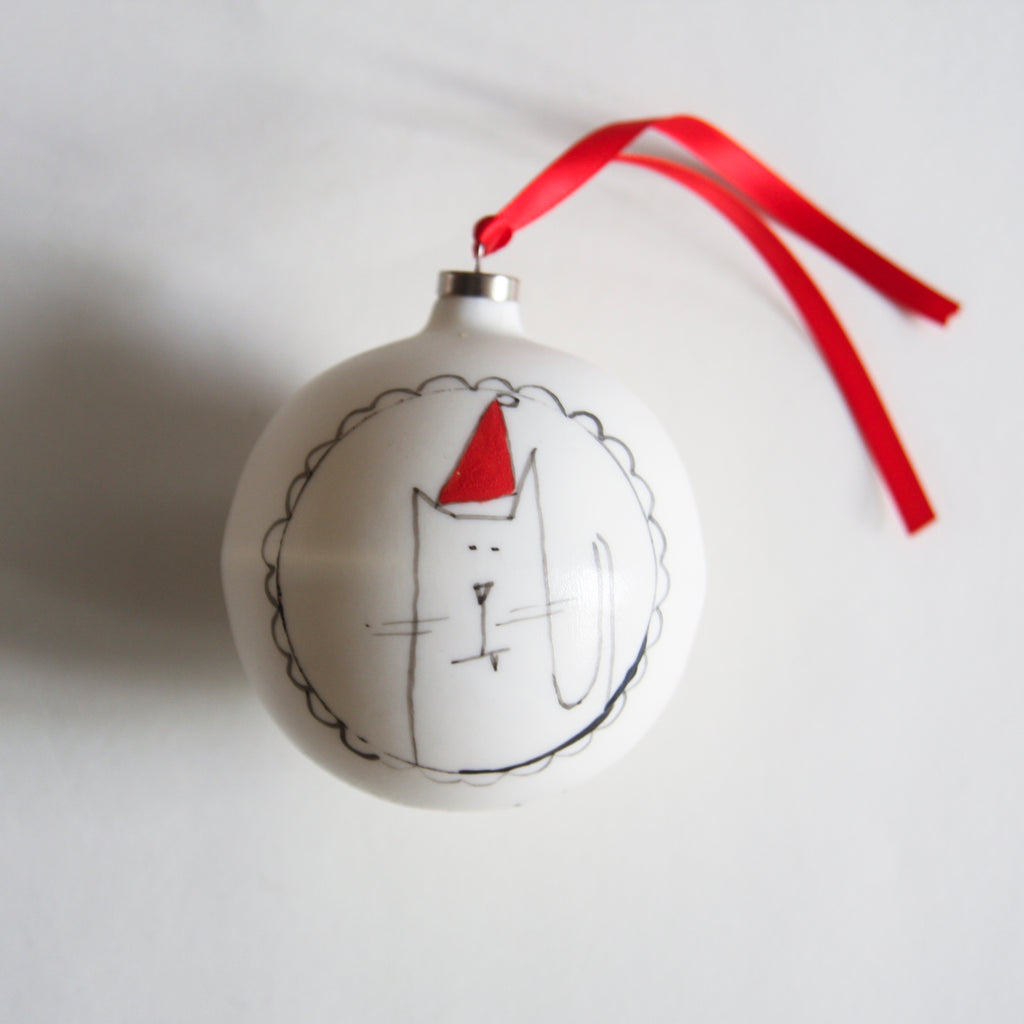 The old fashioned portrait of a slightly grumpy cat in a Santa hat, painted onto a porcelain bauble. The back of the bauble has a simple image of a winter berry branch.