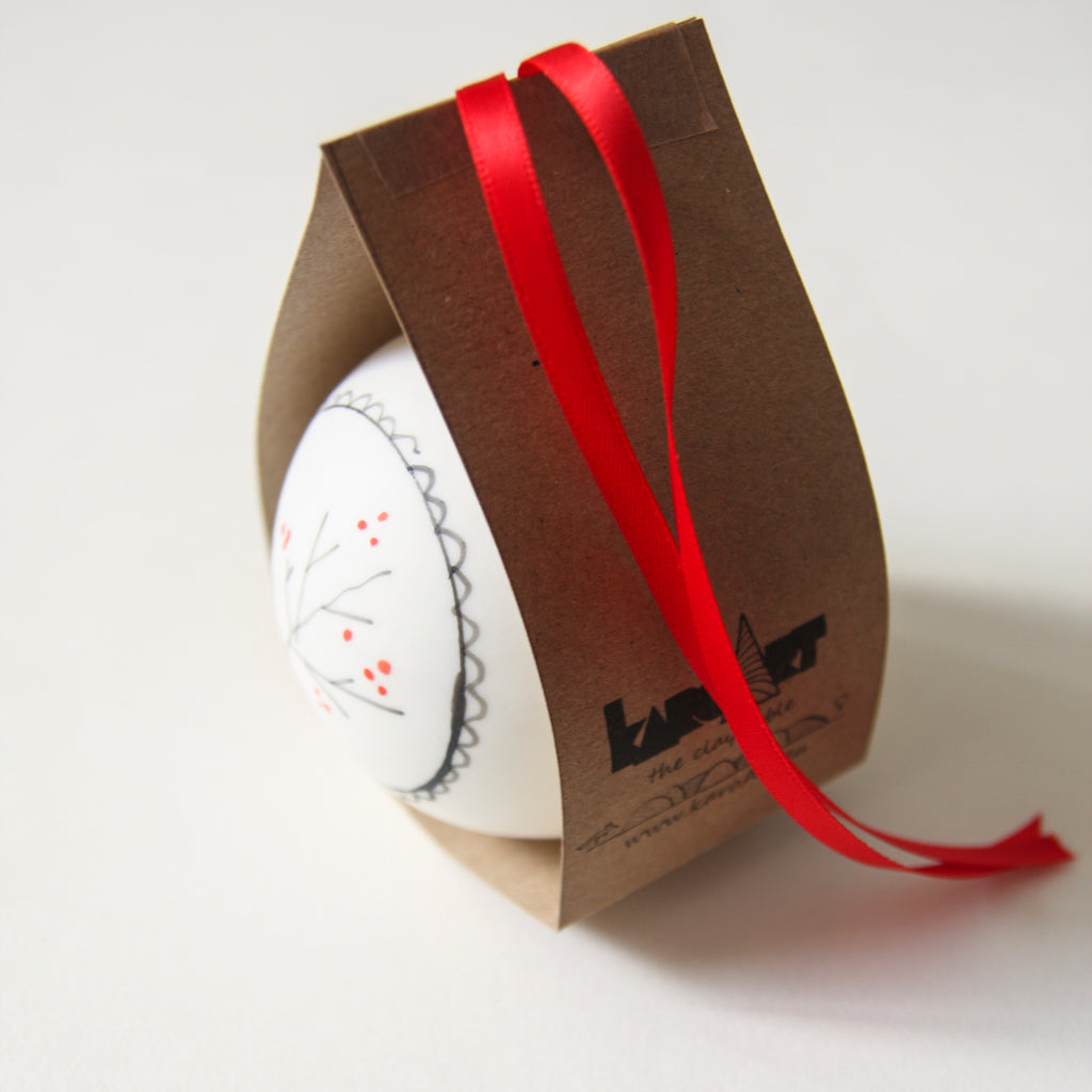 The black doodles are in a striking contrast with pure white porcelain background, further enhanced by a pop of vibrant red.