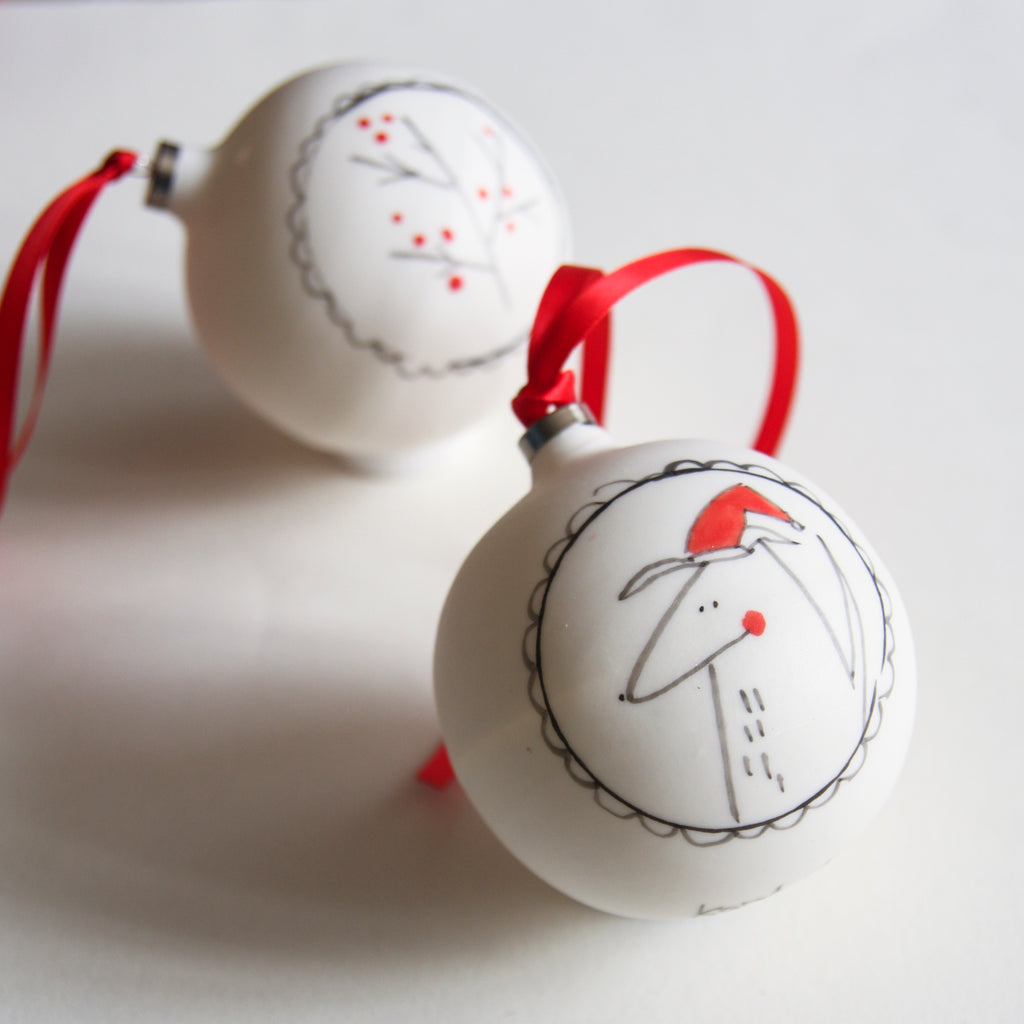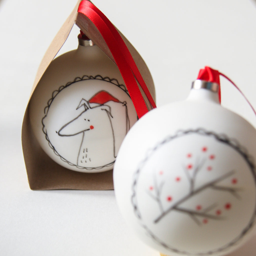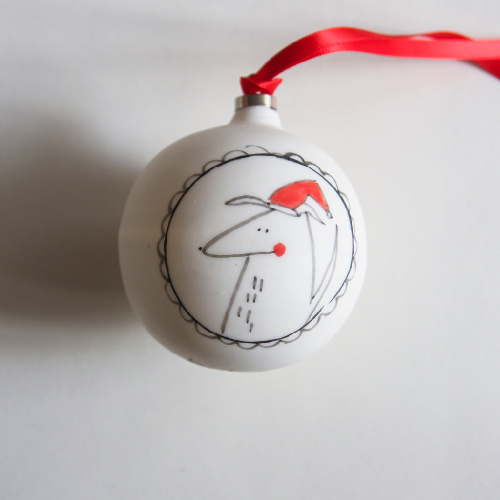 The old fashioned portrait of a slightly dog in a Santa hat, painted onto a porcelain bauble. The back of the bauble has a simple image of a winter berry branch.