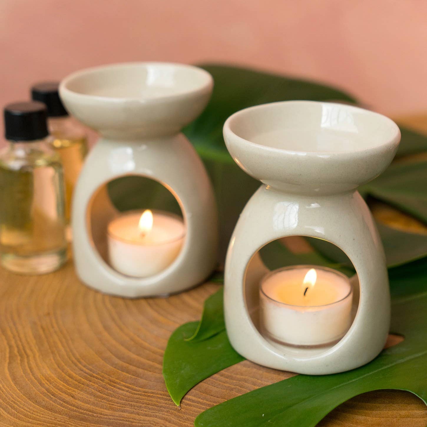 A traditional style ceramic oil burner in white or green with a glossy finish. Provides a soothing natural light and pleasant aromatherapy in use.