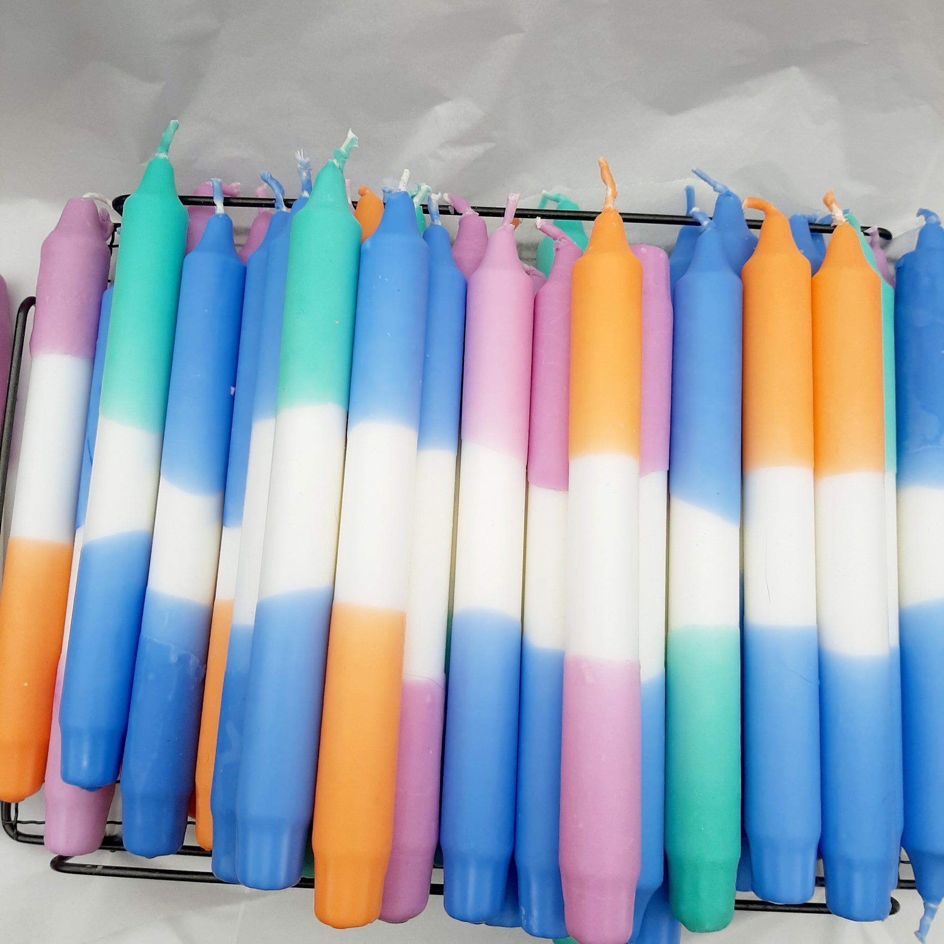 PLEASE NOTE: As these are all handmade, the candle may look different to the ones pictured. Do not twist the candle into the holder as this may cause the coloured wax to crack off. Never leave a candle unattended.