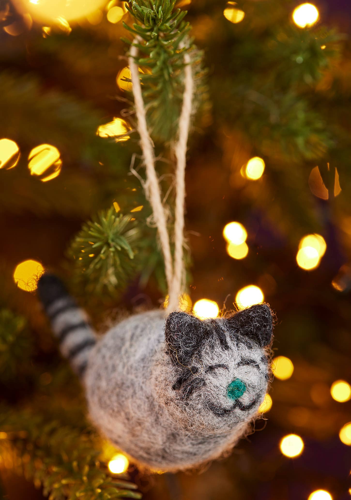 Cat lovers will purr over these adorable needle felt decorations with stripey tails and faces. Ideal for year-round display and a perfect small keepsake gift; a lovely handmade hanging ornament will add cheer to someone's day. With endearing sleepy faces in white and grey, the cute kitties are ready to mount with jute thread. PLEASE NOTE: this is for one cat decoration only and it can be either colour. If you would like a certain type, please let us know when ordering and we'll see what we can do ;)