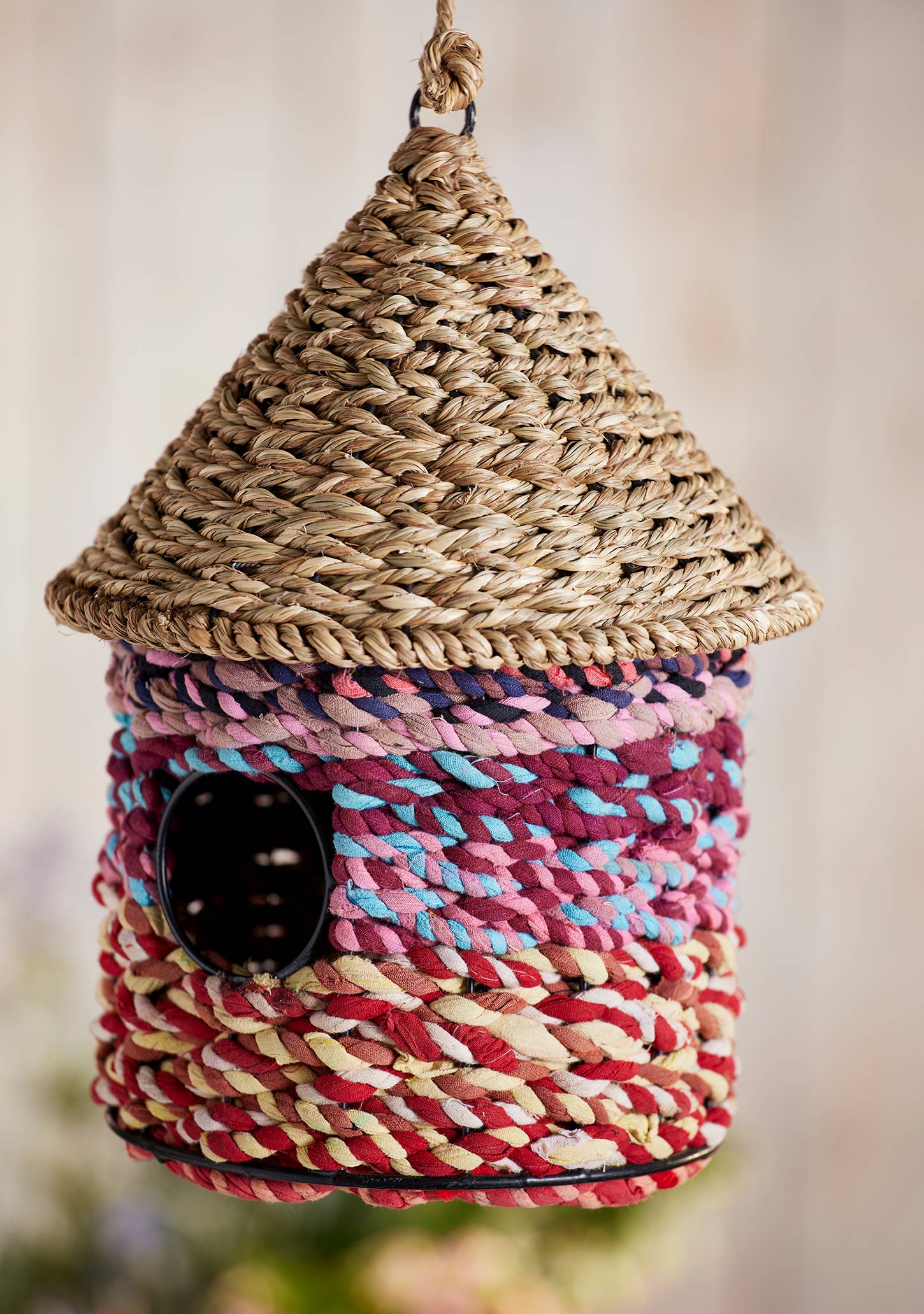 A sustainable garden decoration to add more color to your outside space. The birdhouse has a cylindrical domed roof and a round front opening. Charming in its simplicity, it is completed by a contrasting recycled sari mix body and a natural hanging cord.