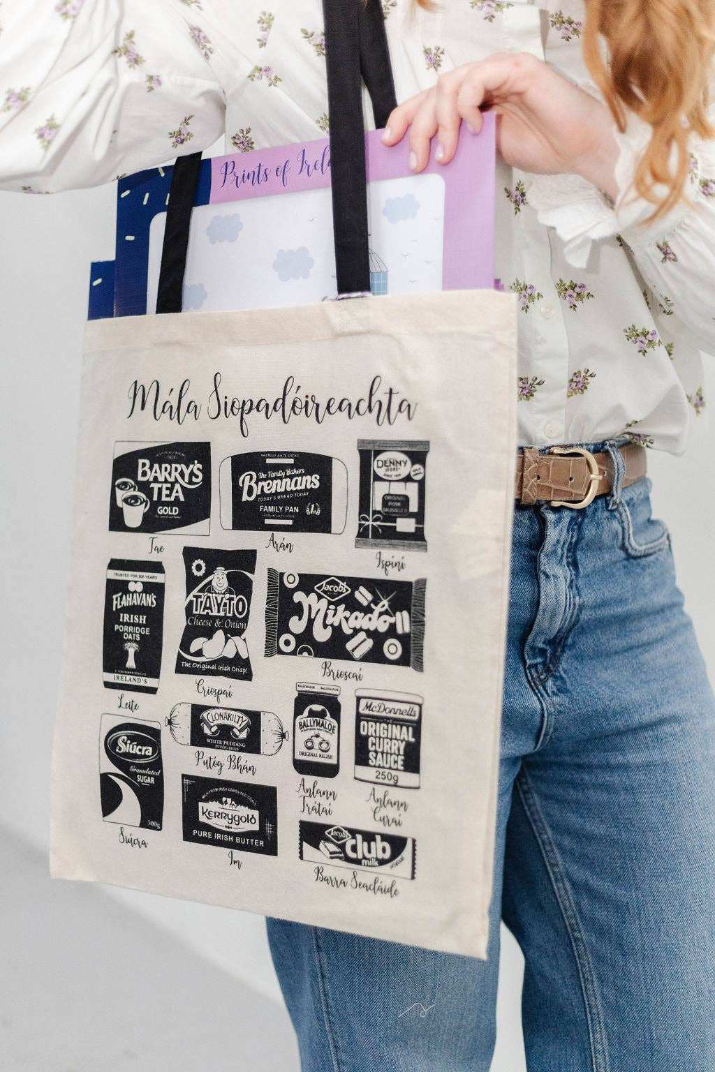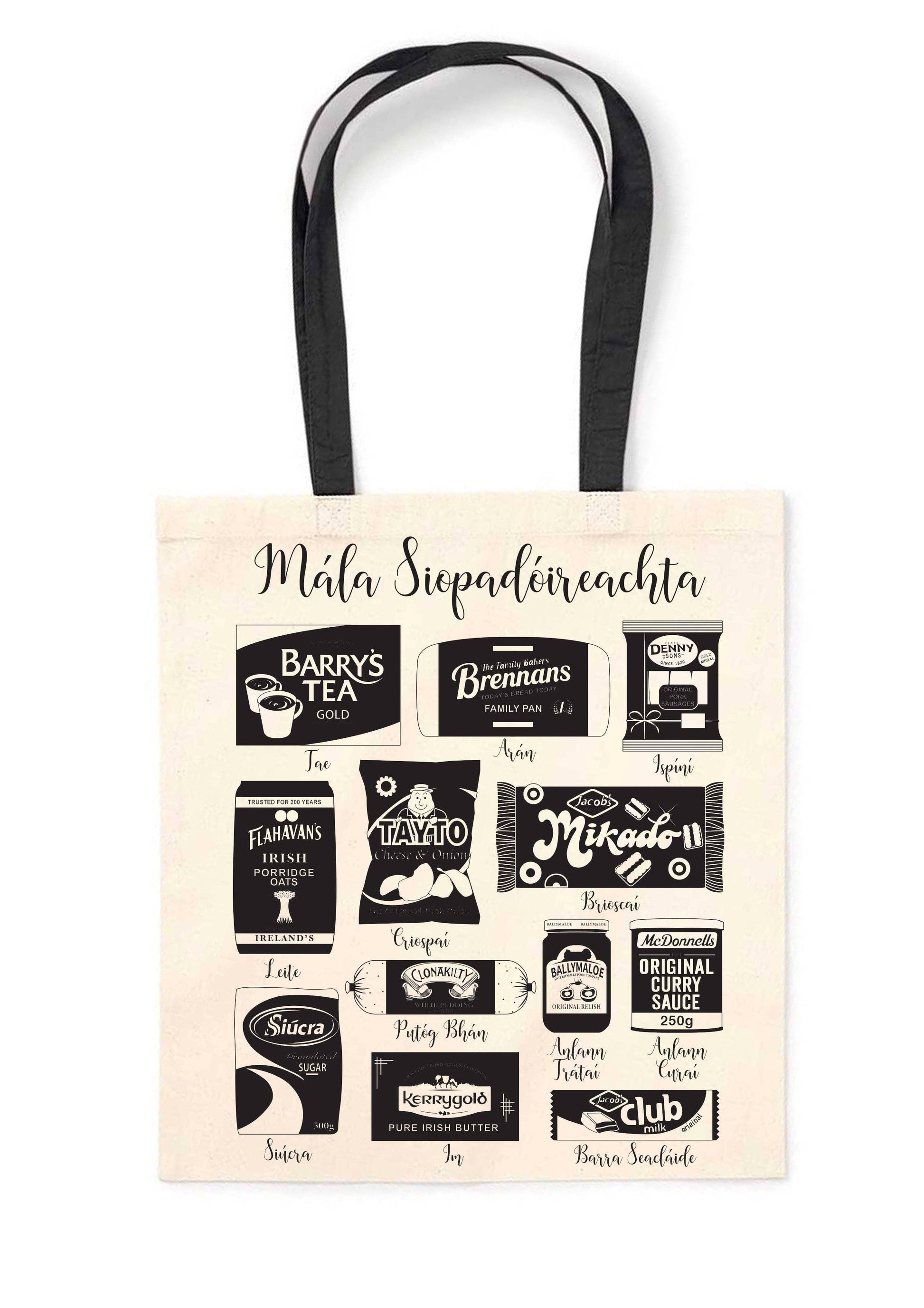 Screen Printed Art & Handles are Black in colour. Irish groceries design featuring: Barry's Tea Bags, Brennans Bread, Denny Sausages, Flahavan's Porridge, Tayto Crisps, Jacob's Mikado, Siúcra, Clonakilty Pudding, Ballymaloe Relish, McDonells Curry Sauce, Kerrygold Butter, Jacob's Club Milk.
