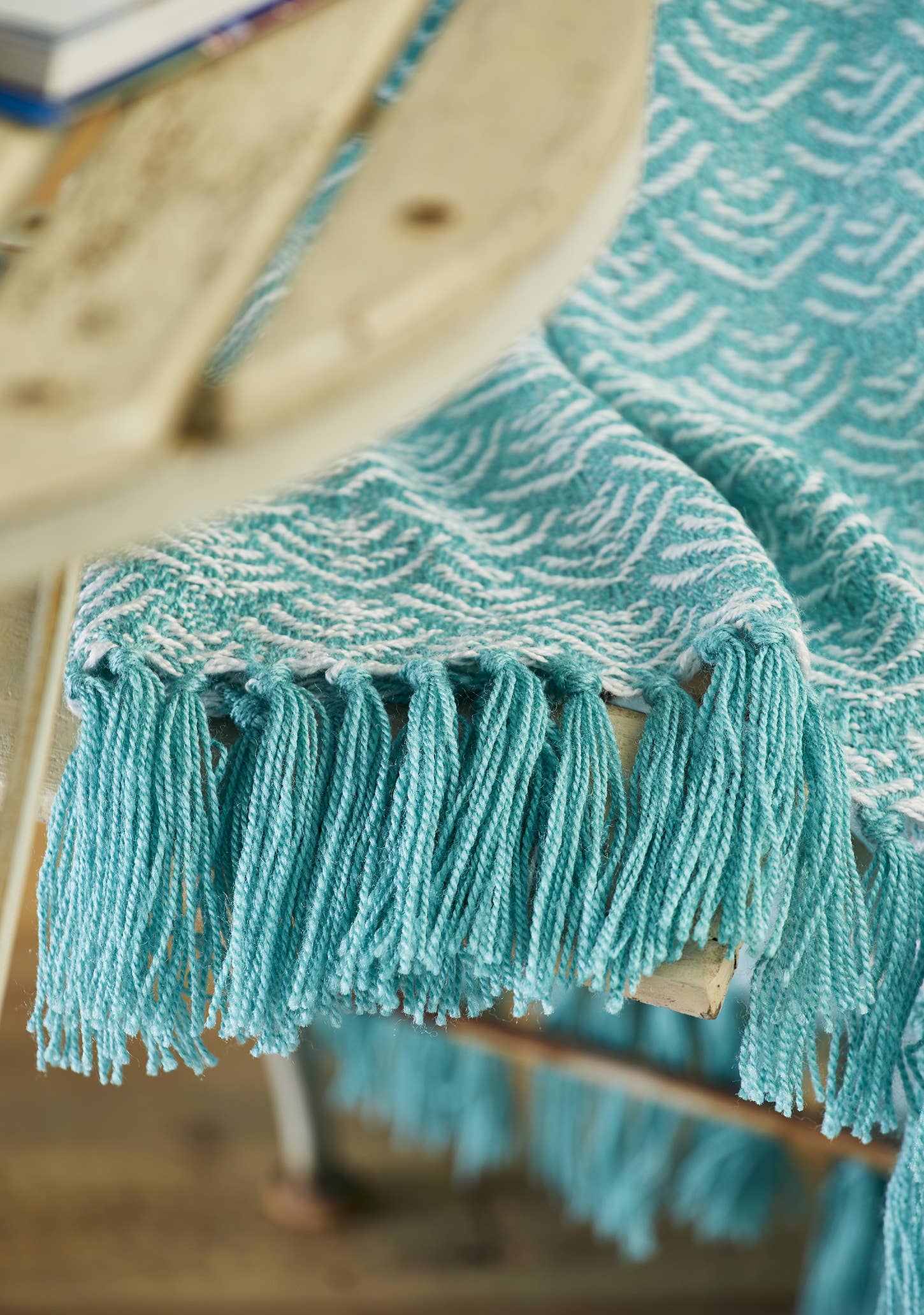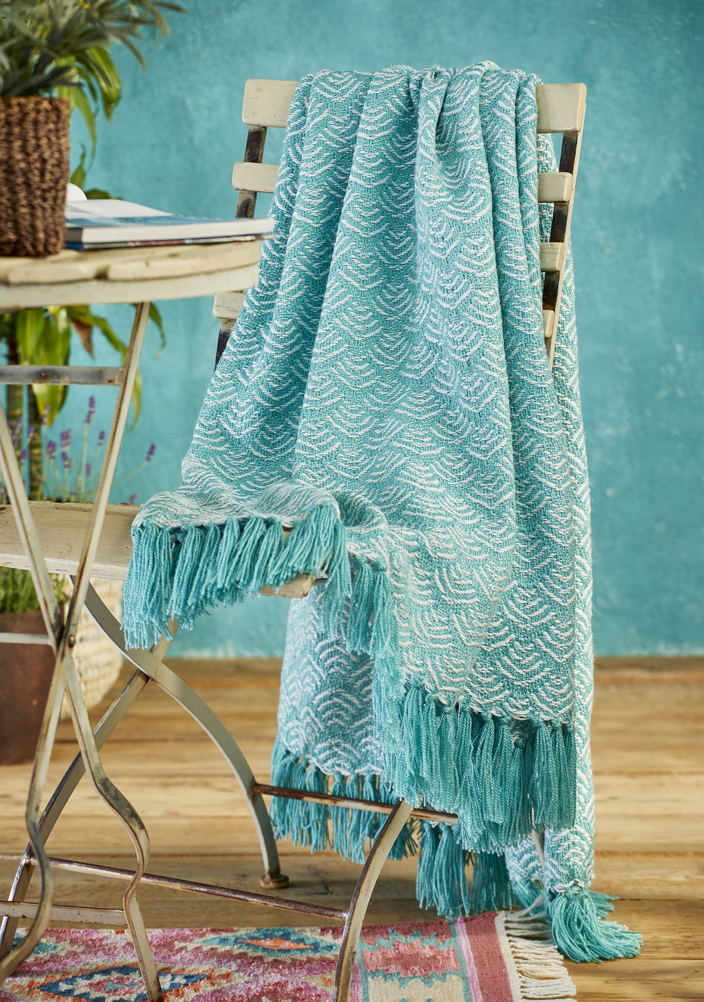 This fresh turquoise waves patterned throw has complementary colour end fringes. Woven from a yarn derived from waste plastic bottles, this eco friendly delight is the perfect outdoor throw. It offers natural stain and UV resistance, and no home for dust mites. A versatile fabric for indoor or outdoor use, it is soft to the touch, washable and quick drying. Use indoors for warmth and decor, as a garden throw, picnic blanket, at the beach or by a swimming pool.