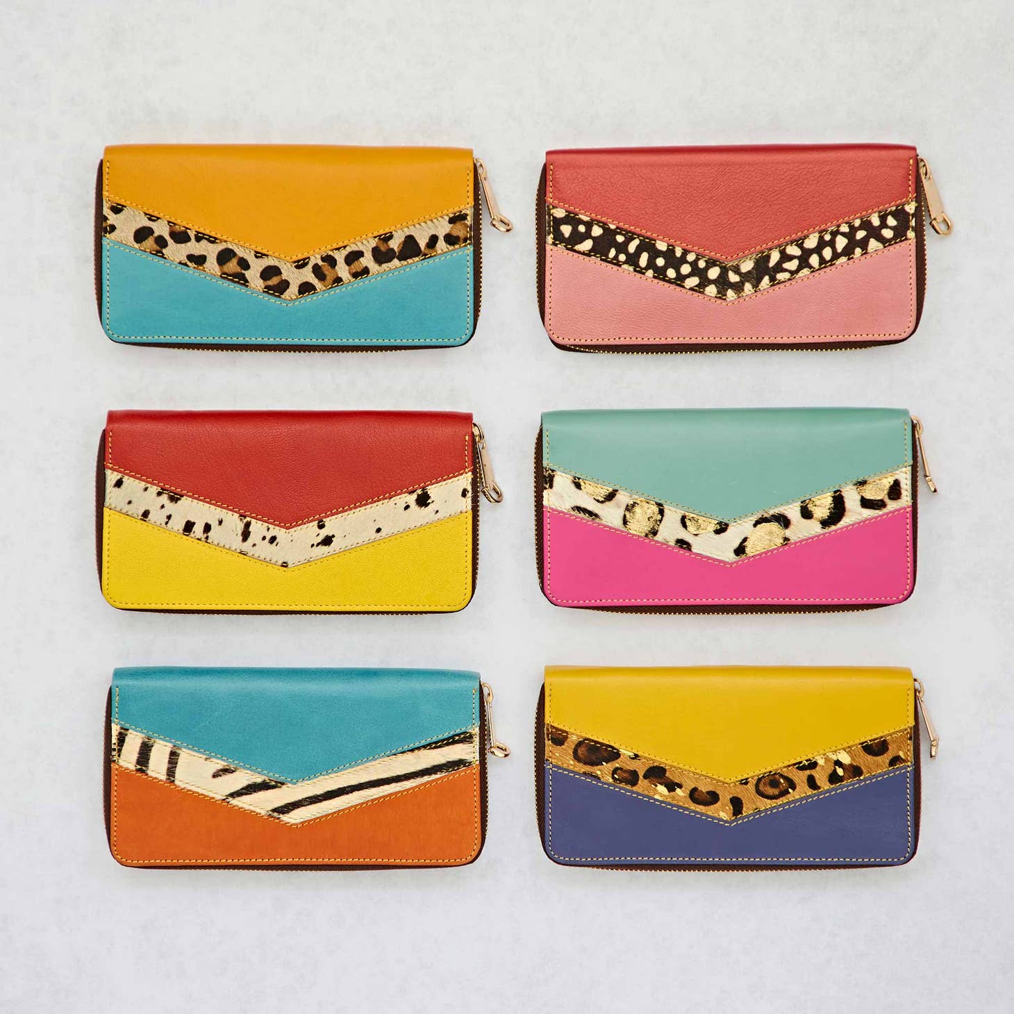 Add a pop of colour to your outfit with this one-of-a-kind recycled leather clutch purses. Handcrafted from recycled leather, each one is a unique patchwork of bright colours, stylish patterns and animal prints.