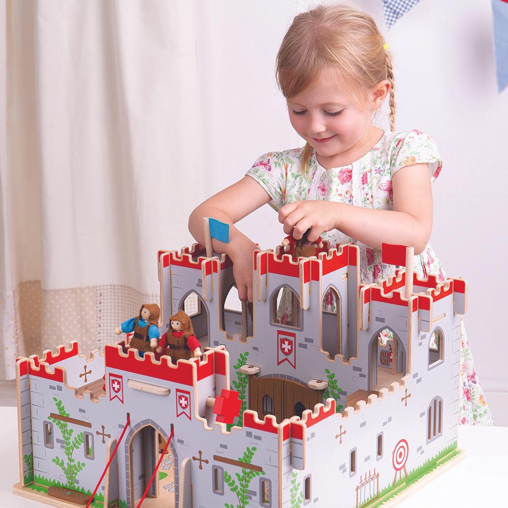 Home to the King and Queen, this beautiful wooden castle from Bigjigs features a fully functioning drawbridge, balconies and working doors. There's even a secret door so knights can sneak out without being seen by the enemy! Keep the enemies out with the fully functioning drawbridge, and remove the red or blue flag depending on who has claimed the castle. Endless role playing possibilities abound inside this absorbing playset where the magic lives on forever. Just be sure to stay on your guard! Simply slot together the wooden pieces, and let the adventure begin. A great way to develop storytelling skills, build vocabulary and develop dexterity. Royal family and Medieval knights are available separately.