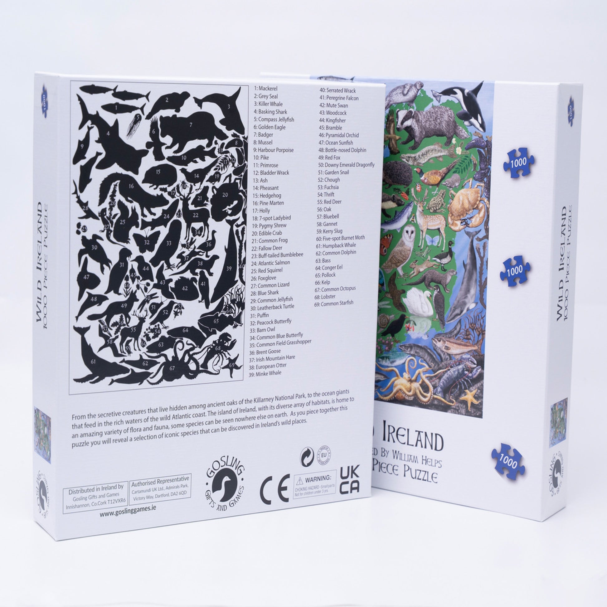 Embark on a journey through Ireland’s untamed beauty as you piece together this richly illustrated 1000-piece puzzle. From the secretive creatures that dwell among the ancient oaks of Killarney National Park to the ocean giants that roam the wild Atlantic waters, each section reveals another wonder of the island’s incredible biodiversity.