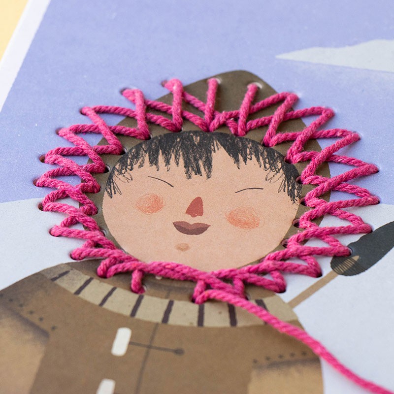 An embroidery kit with everything you need to learn to sew: coloured wool, 2 needles that do not prick and 8 cardboard templates.